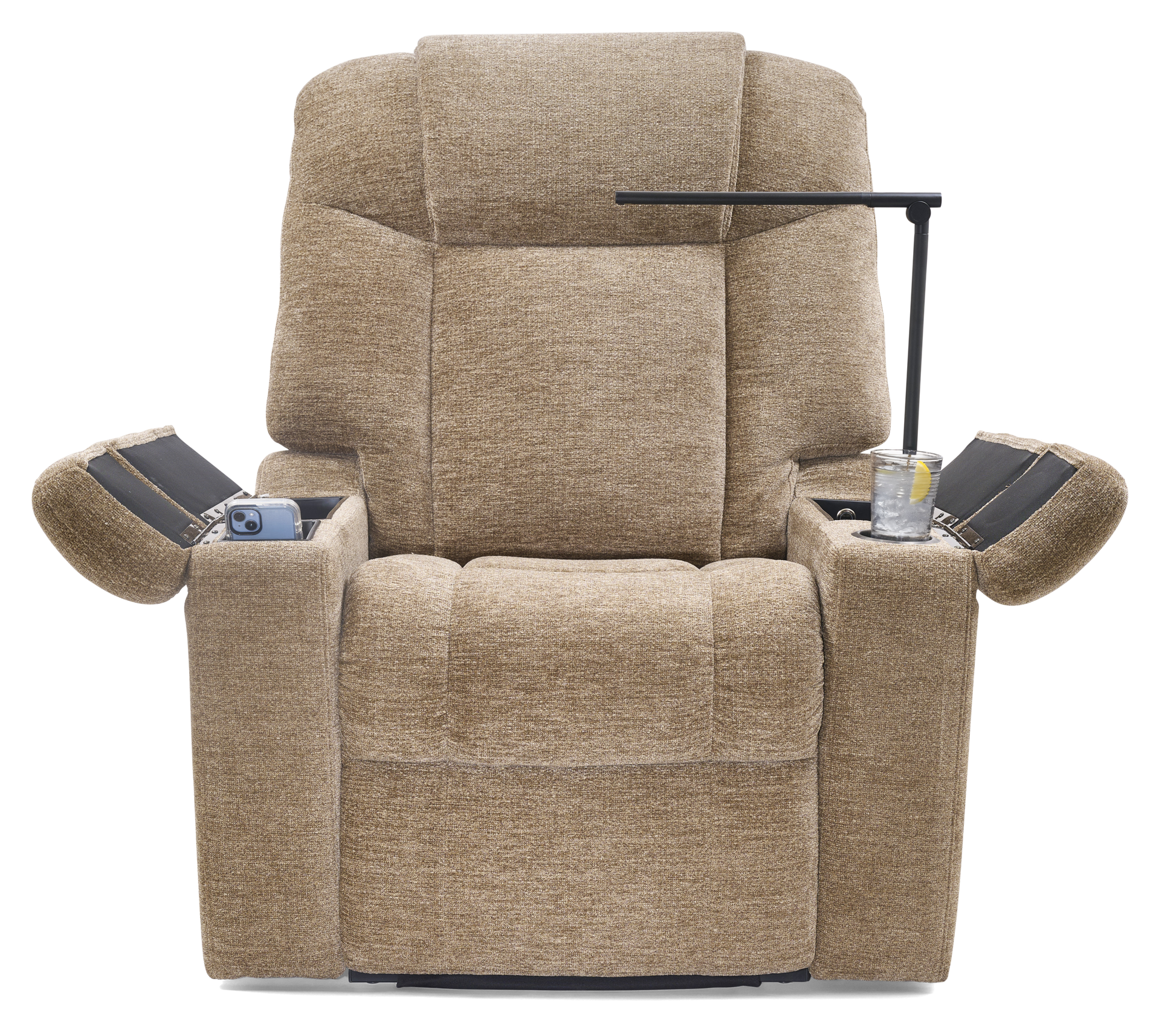 Step into everyday luxury with the Venice by UltraComfort. Designed for total relaxation, the Venice features a generously padded seam back, plush chaise pad, and a sleek open-arm design that includes a built-in cup holder, hidden storage, a power port with a removable reading light and tray table, a wireless phone charger, and a USB port—all within arm’s reach.